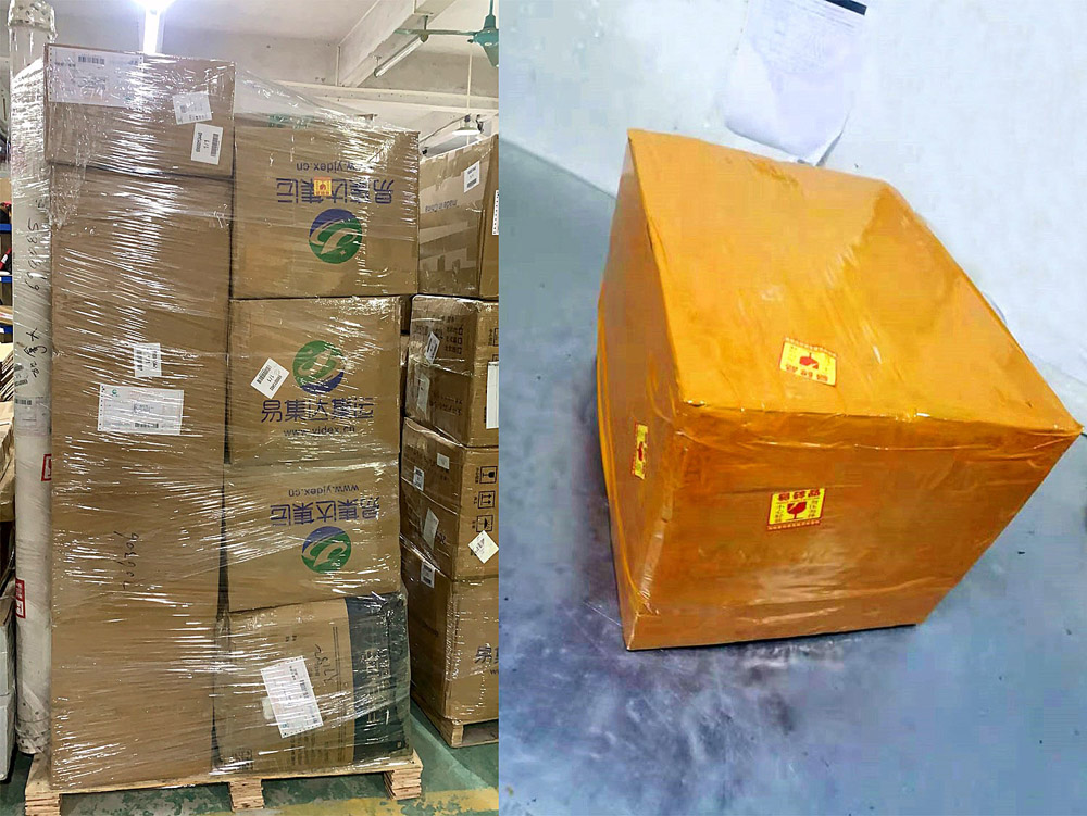 外箱裹上保鲜膜或用黄色胶带360度无死角打包 防水、防潮