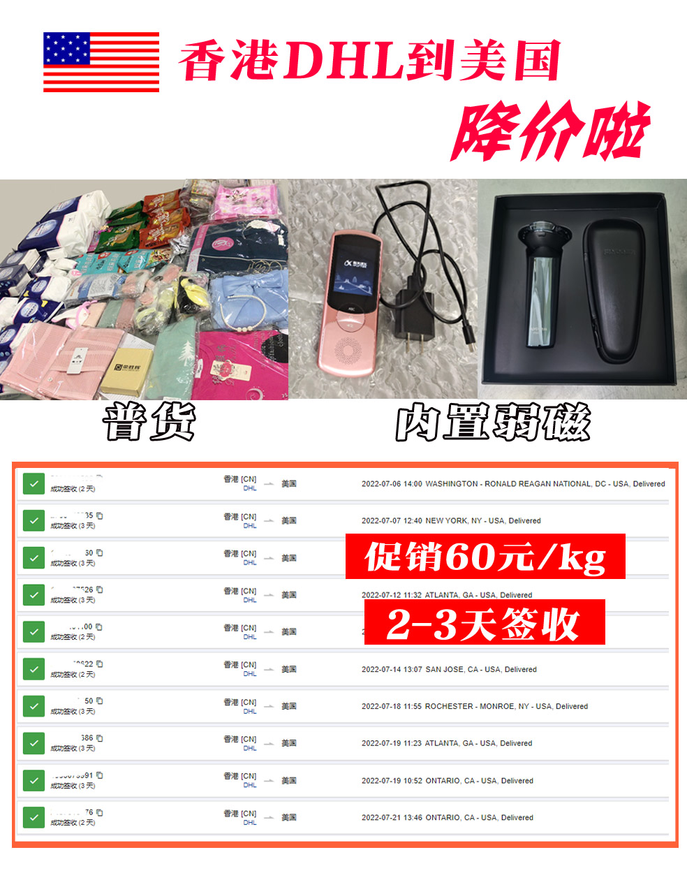 HKDHL到美国降价啦,60元/kg,2-3天签收
